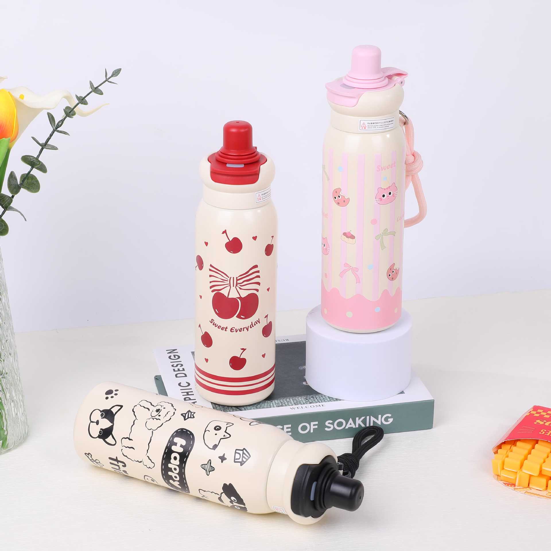This water bottle features a sweet cherry pattern, a red strap for easy carrying, and a design with the phrase "Sweet Everyday". Multiple styles are available for you to choose from.